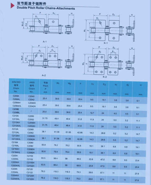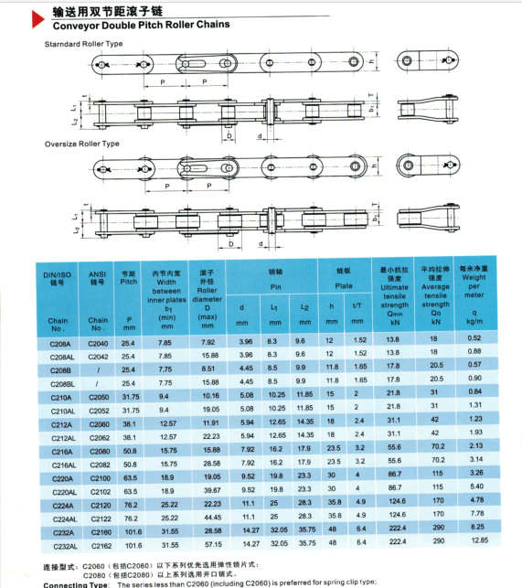 3, C212A C212AL C2060 C2062 C212AH C212AHL C2060H C2062H 節(jié)距38.1毫米的直板大滾子或者小滾子輸送雙節(jié)距鏈條,俗稱1.5寸鏈條。
