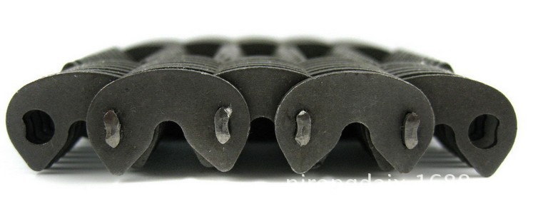 HV416-96l哈瓦鏈條:一種雙軸的齒形鏈條,軸是兩根用,在一個鏈條孔里面有兩個瓦片銷軸。下圖是HV416齒形鏈條。有5個導向片,60個帶尖的齒形鏈片,長度106.5毫米,2500元一條。