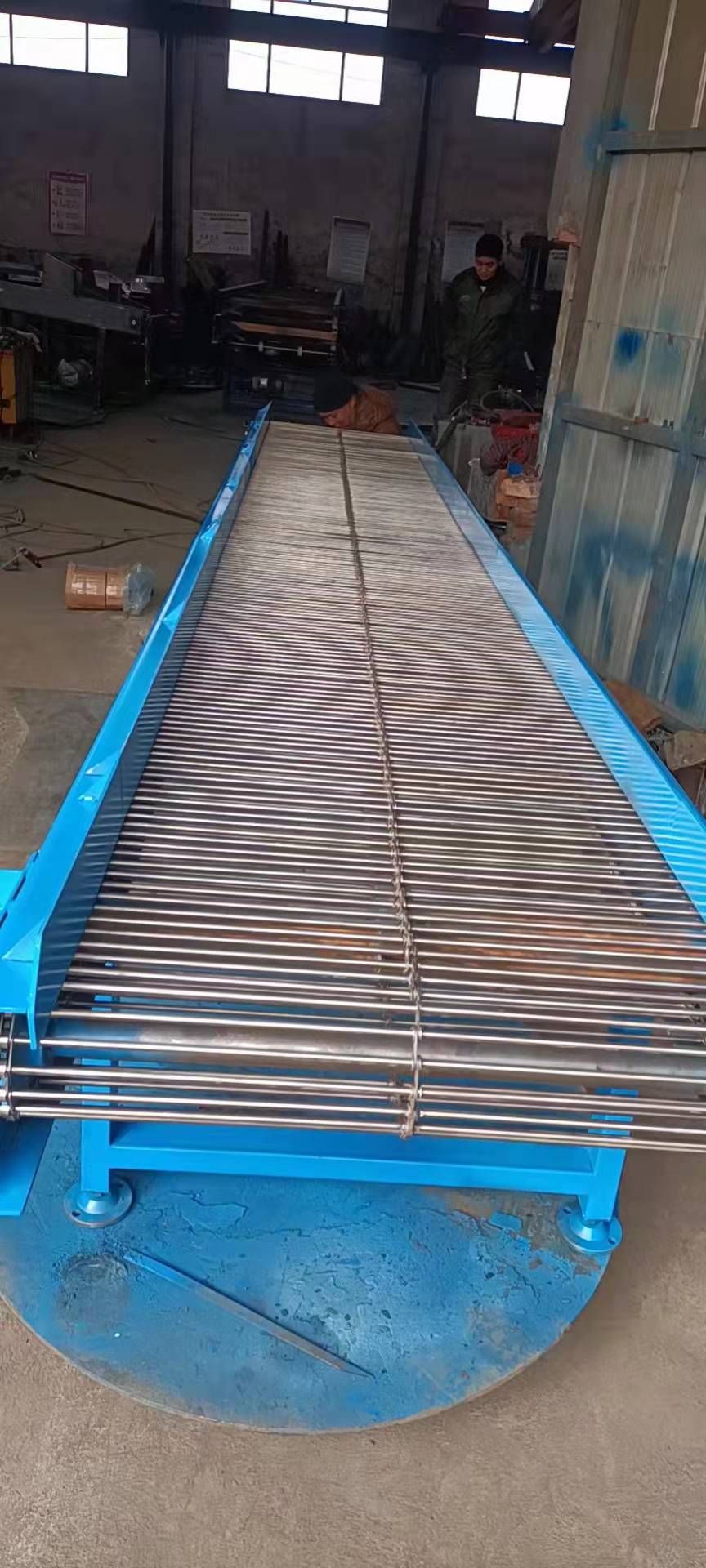 給淄博 山東超越輕工制品有限公司定做的玻璃瓶降溫傳送帶輸送機完工今天發(fā)貨 鏈桿片輸送機 長度5米 有效寬度720毫米 高度800毫米 從地面到鏈桿輸送帶上平面是800毫米 可調(diào)節(jié)的高度再700-800毫米之間 實際調(diào)節(jié)距離100毫米 節(jié)距25.4毫米 支軸直徑8毫米 在輸送帶中間加一趟鏈條片