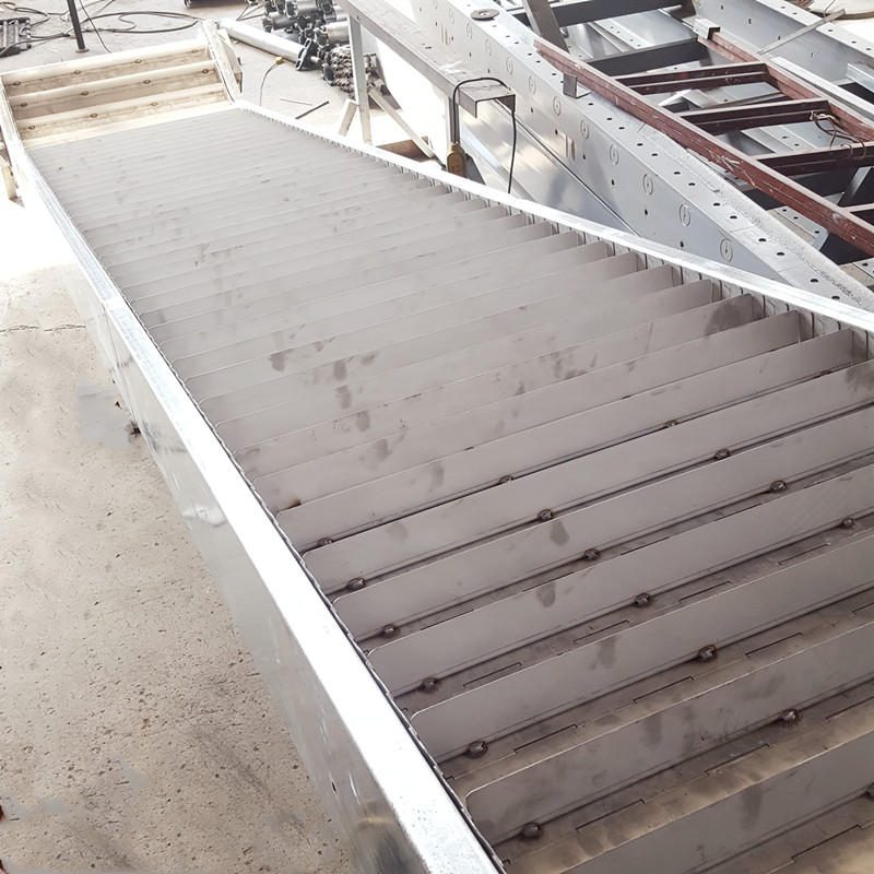 鏈板提升機(jī)長(zhǎng)度6米, 鏈板帶側(cè)擋板和橫擋板有效高度60毫米 鏈條50.8毫米 橫擋板間距100毫米一個(gè) 有效寬度800毫米 先水平直輸 再提升 再水平直輸。