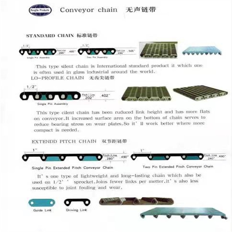 無聲齒形鏈帶:采用鏈條片和銷軸于墊圈做成的輸送用傳送帶,外形寬度非標定做也有好多規(guī)格的現(xiàn)貨,鏈帶是用在玻璃廠輸送玻璃瓶罐器皿日用玻璃器皿的,也有的時候用在其他的輸送機械上,用來輸送其他產(chǎn)品,優(yōu)點就是平整,輸送面平穩(wěn),輸送高腳杯,不會倒瓶,用來輸送高溫玻璃制品,用于玻璃機械行列式制瓶機上,橫向輸瓶機,我們還研發(fā)了轉(zhuǎn)彎的拐彎的無聲齒形鏈帶,用于縱向拐彎橫向結(jié)合的輸送機上。無聲齒形鏈帶材質(zhì)有碳鋼的 錳鋼的 合金鋼的 ,節(jié)距有12.7毫米 25.4毫米 單軸的和雙軸的,無齒形鏈帶從外形看有內(nèi)導向和外導向,有帶保護帽的和不帶保護帽的,無聲齒形鏈帶有帶尖的和不帶尖的.